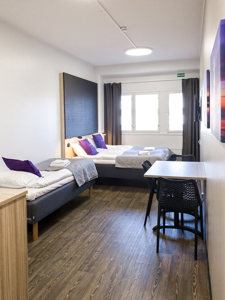 Huoneen varusteluun kuuluu huoneluokan mukainen määrä laadukkaita vuoteita, pyyhkeet, jääkaappi, vedenkeitin, mikro, taulutelevisio, suihku sekä hiustenkuivain.